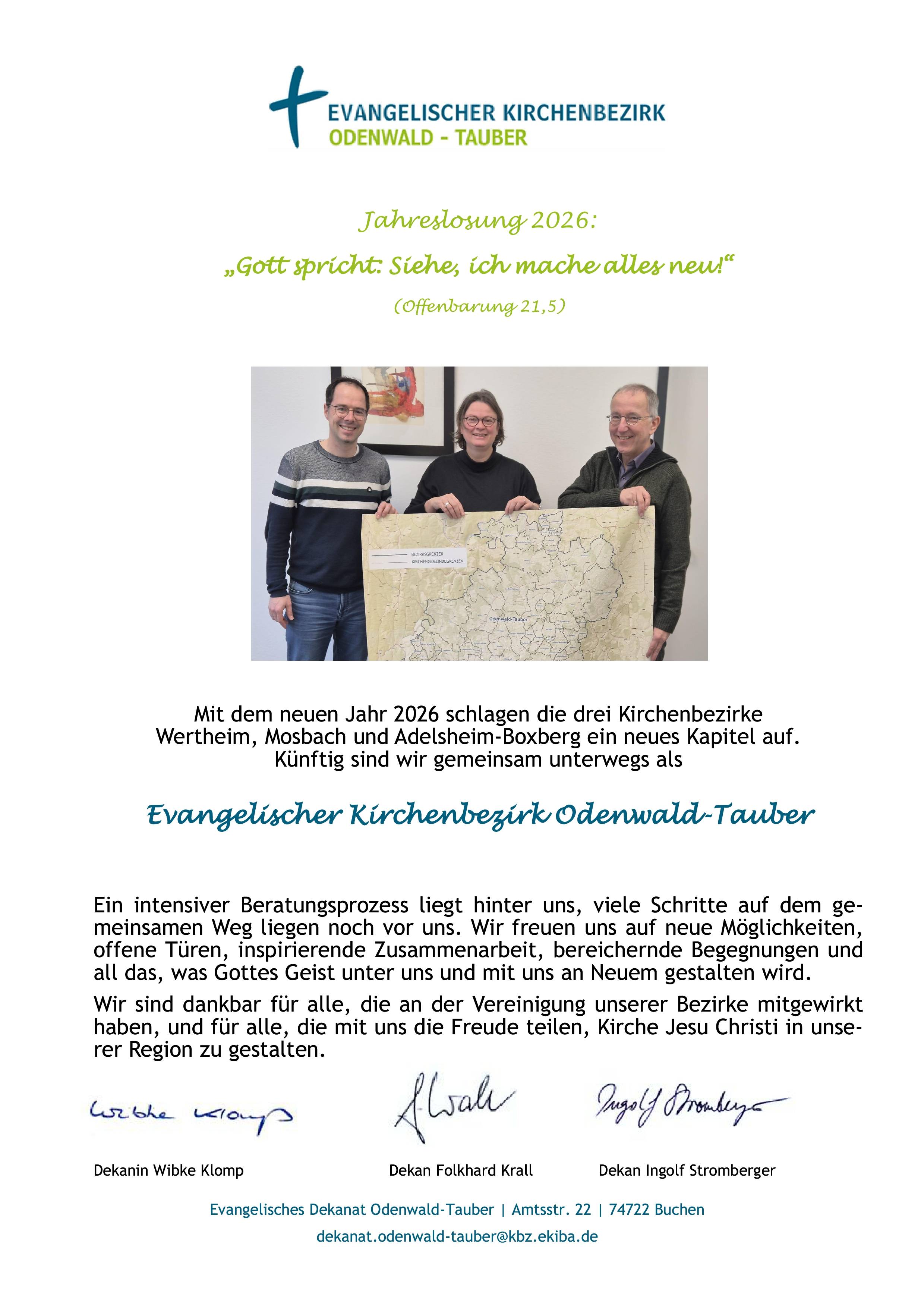 Mit dem neuen Jahr 2026 schlagen die drei Kirchenbezirke Wertheim, Mosbach und Adelsheim-Boxberg ein neues Kapitel auf. Künftig sind wir gemeinsam unterwegs als Evangelischer Kirchenbezirk Odenwald-Tauber.